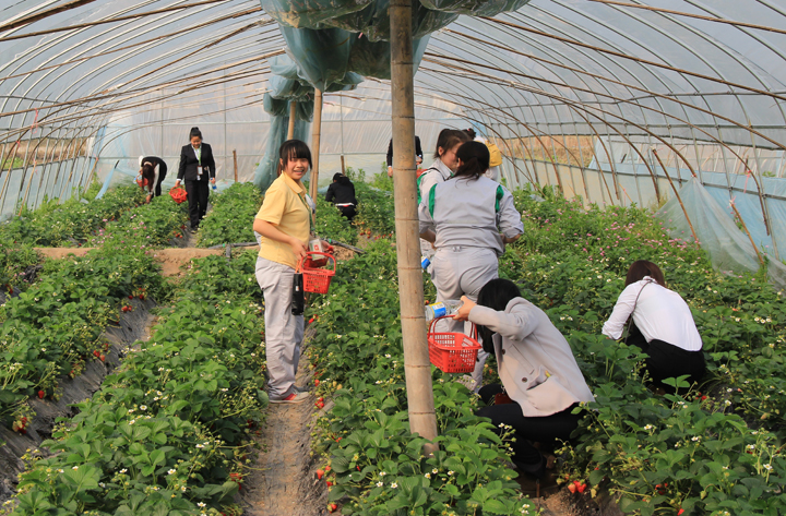 平日里我們總吃著菜市場、超市買來草莓,今天我們來一場身體力行的摘草莓。一行人分成五組進入到不同的采摘棚內(nèi),穿上鞋套,提起籃子,擼起袖子加油摘。挑選、采摘,每個人甄別的方式都有些區(qū)別。有的喜歡個頭小,認為是精華,專挑小小的紅瑪瑙;有的說個頭大是珍品,專挑誘人的巨無霸。倘若看中同一顆,那就是時候來一場手速的比拼了。好吃不怕量大,摘莓不怕腰酸,平日久坐的女同事們此時都是身手矯捷,采摘棚內(nèi)輾轉(zhuǎn)騰挪,頗有女俠風范。
