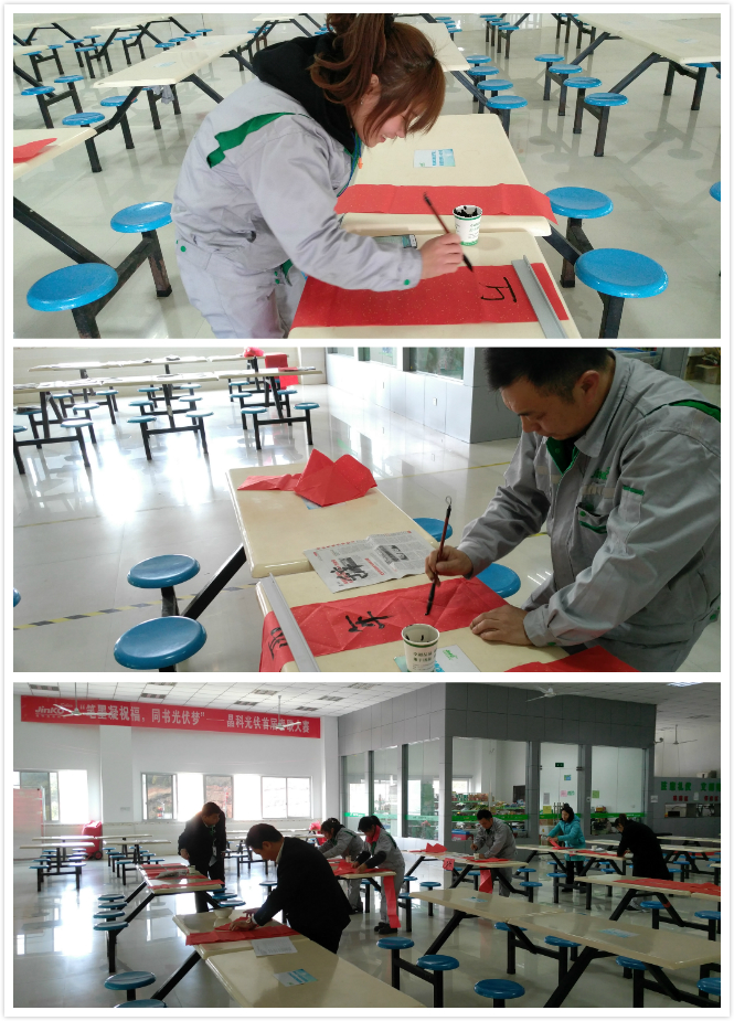 2018年2月8日,主題為“筆墨凝祝福,同書光伏夢”的晶科光伏首屆春聯大賽于食堂二樓舉行。二十余位來自各部門、各車間的“書法家”揮毫潑墨,為晶科光伏送上了2018年美好的祝愿。本次活動旨在為員工提供一個展示吉祥祝福話語的平臺,為員工提供一個表現個人才華風采的機會,同時豐富員工的業(yè)余文化生活。